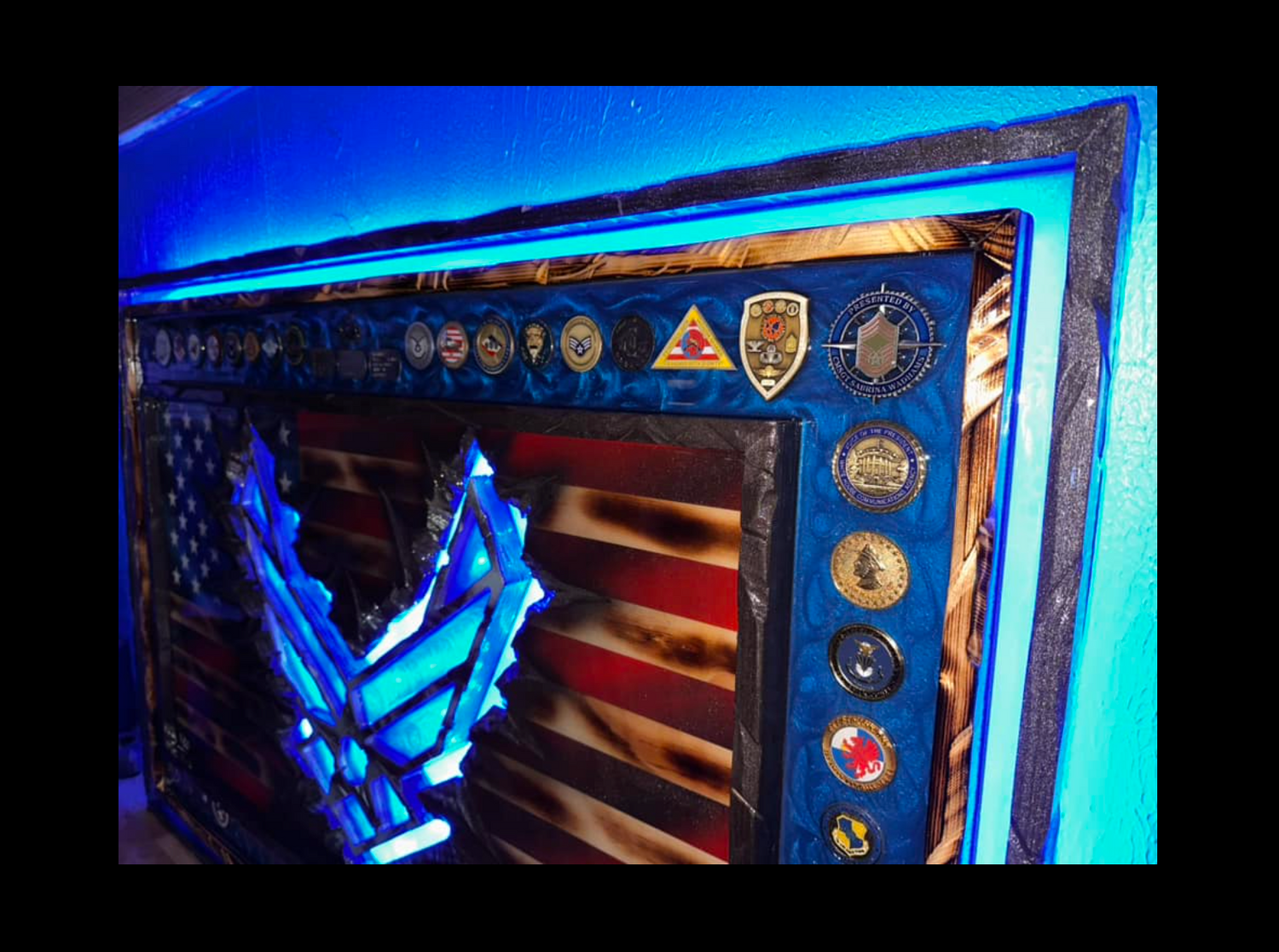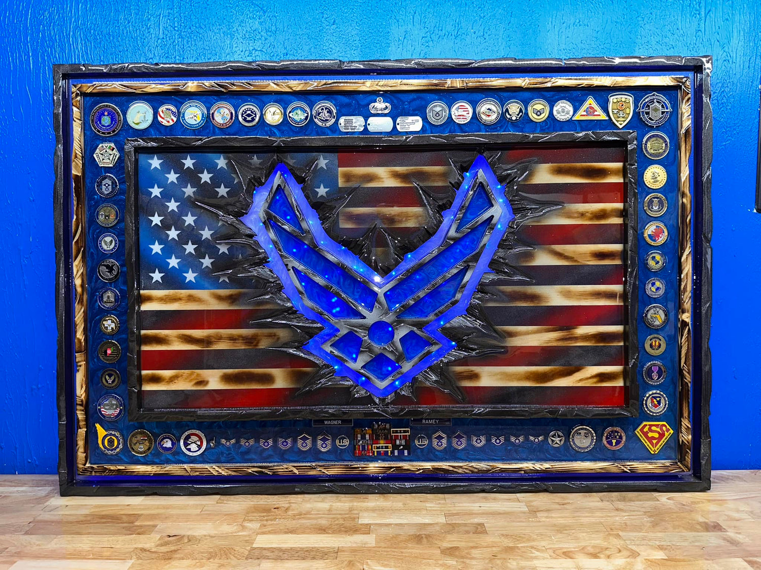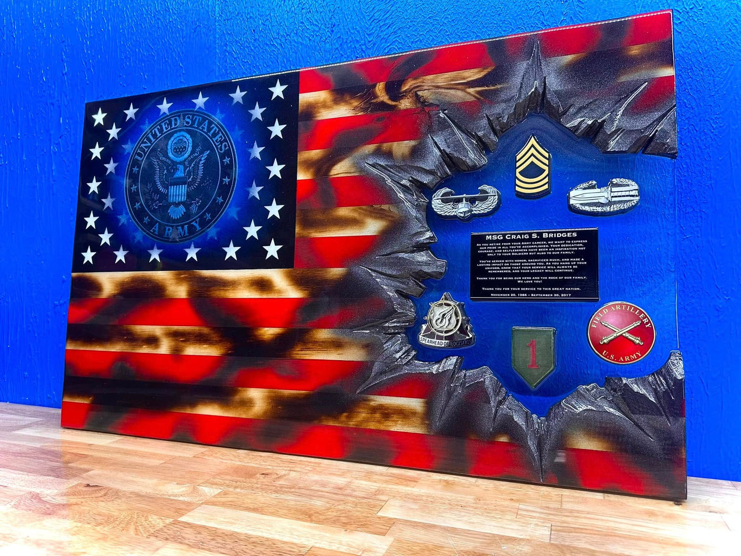 Take your most precious articles from your service and embed them permanently into the flag - Ribbon racks, coins, dog tags, you name it!