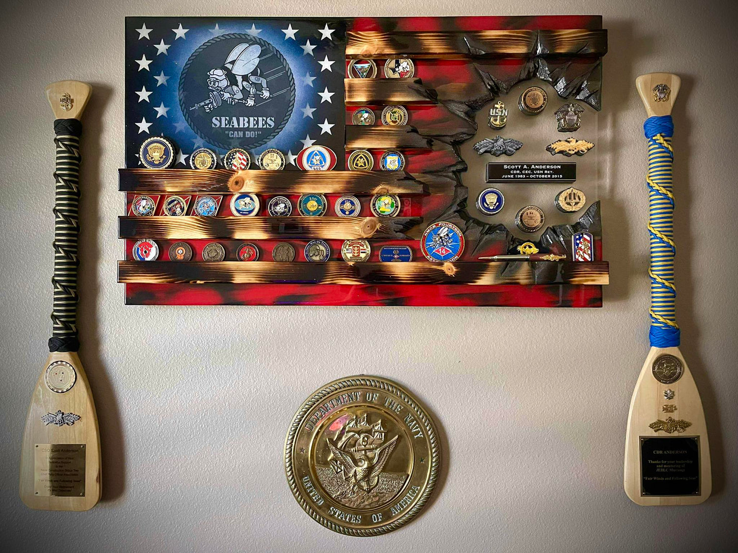 Take your most precious articles from your service and embed them permanently into the flag - Ribbon racks, coins, dog tags, you name it!