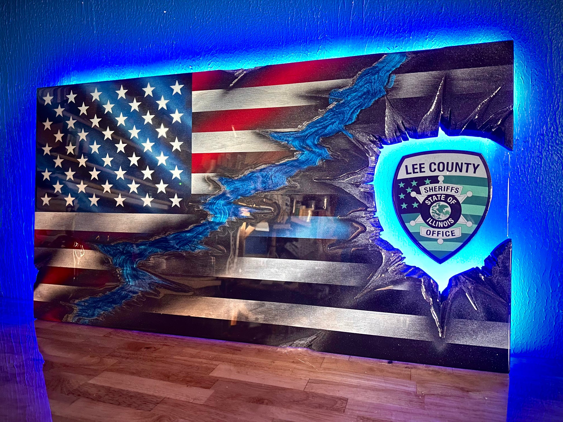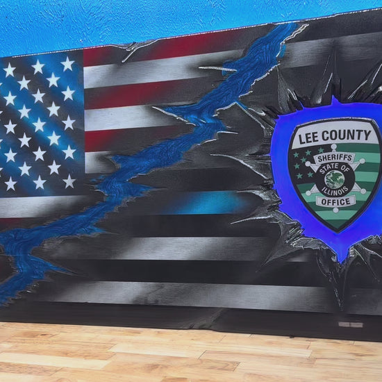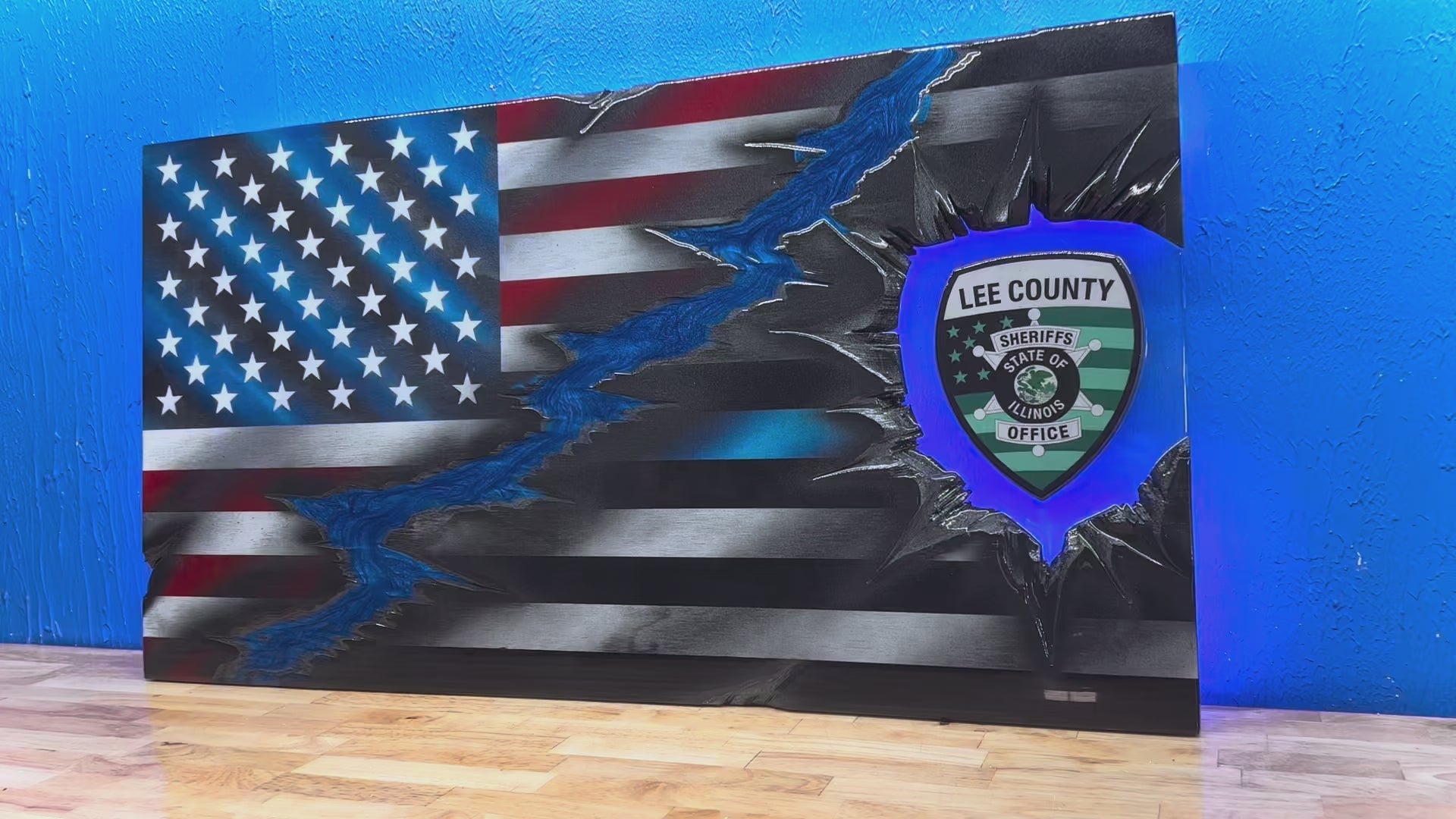 The Darker Traditional Midnight Thin Blue Line Patch Series Split! This flag combines a Darker Traditional color wave with our best selling Midnight Thin Blue Line Series. A hand-carved blowout on the right side, finished off with a hand-carved split filled with electric blue swirled micro pigment. We can accommodate any number of logos (Each one after the first is a $20 upcharge).