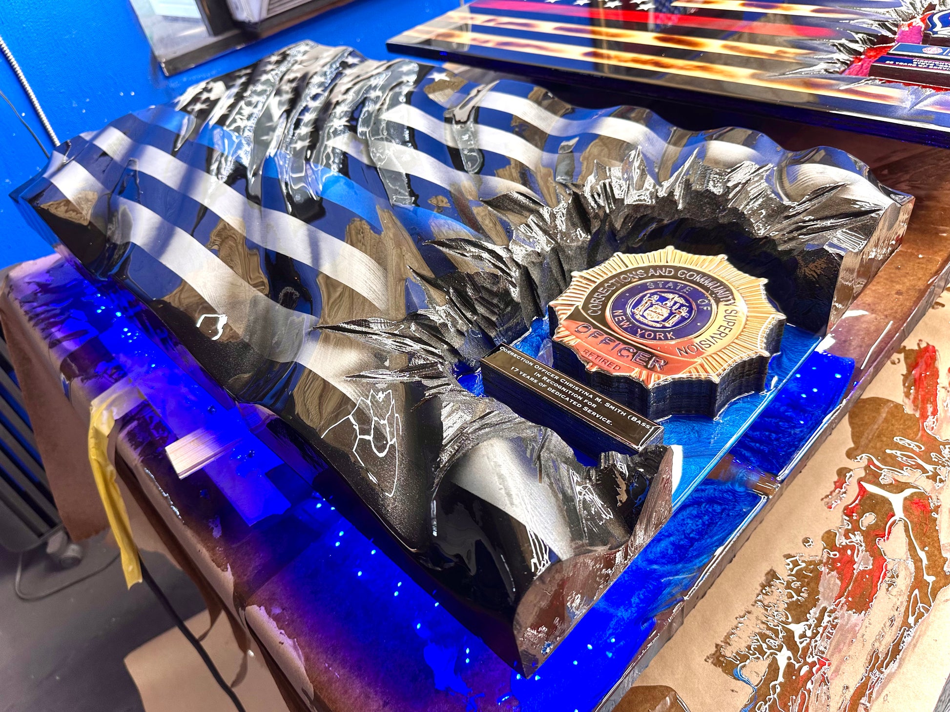 This isn’t just any wavy flag—it’s the most professional, handcrafted 3D wavy flag on ETSY, and the most difficult flag in our entire arsenal. Unlike mass-produced CNC flags, each one starts as a solid block of wood, then is meticulously hand-carved, hand-sanded, hand-painted, and flawlessly sealed with two ultra-thick coats of epoxy for an unmatched glasslike finish. The result? A bold, vibrant masterpiece that commands attention. Built for the patriot that puts the uniform on with pride! This listing combines our professional WAVY flag with the "Patch Series" style flag - Incorporating your custom badge or patch into the blowout area. You can also add a plaque if needed for no charge.
